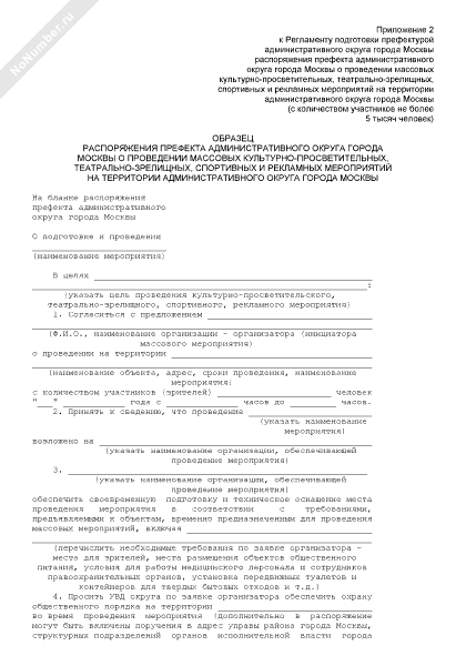 - 975Образец распоряжения префекта административного округа города Москвы о проведении массовых культурно-просветительных, театрально-зрелищных, спортивных и рекламных мероприятий на территории административного округа города Москвы