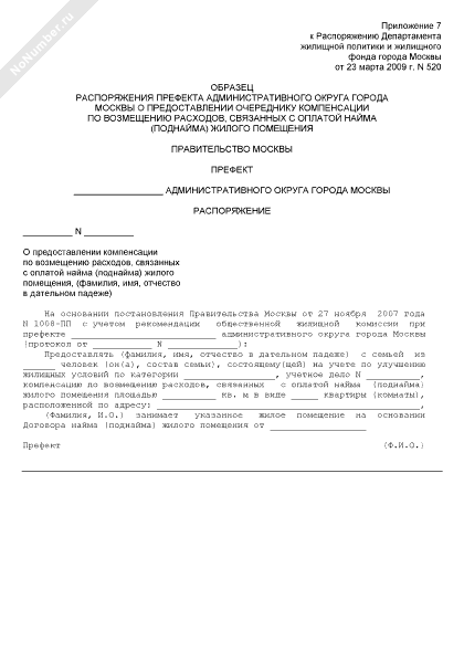 - 968Образец распоряжения префекта административного округа города Москвы о предоставлении очереднику компенсации по возмещению расходов, связанных с оплатой найма (поднайма) жилого помещения
