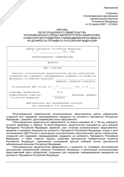 - 979Образец регистрационного свидетельства уполномоченного представителя группы избирателей, созданной для поддержки самовыдвижения кандидата на должность Президента Российской Федерации
