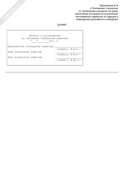 - 1241Образец штампа, проставляемого на принятых конкурсной комиссией к рассмотрению заявках на участие в конкурсе на право заключения договора на выполнение пассажирских перевозок на территории городского округа Химки Московской области по маршруту (маршрутам) регулярного сообщения