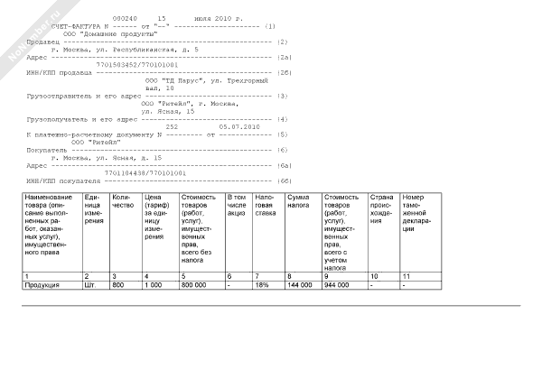 Фрагмент счета-фактуры производителя на отгрузку продукции (рекомендуемый образец заполнения)
