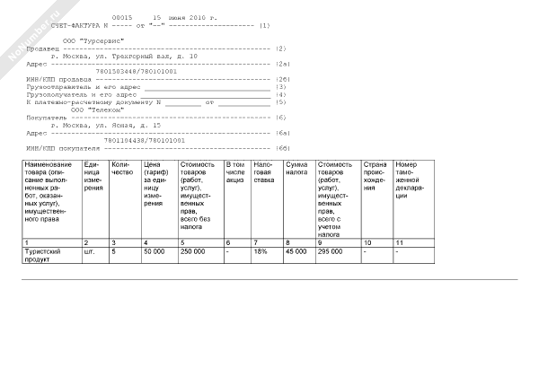 Фрагмент счета-фактуры турагента на отгрузку туристских продуктов (рекомендуемый образец заполнения)