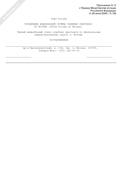 Образец бланка постановления первого межрайонного отдела судебных приставов по Центральному административному округу г. Москвы (рекомендуемый образец заполнения)