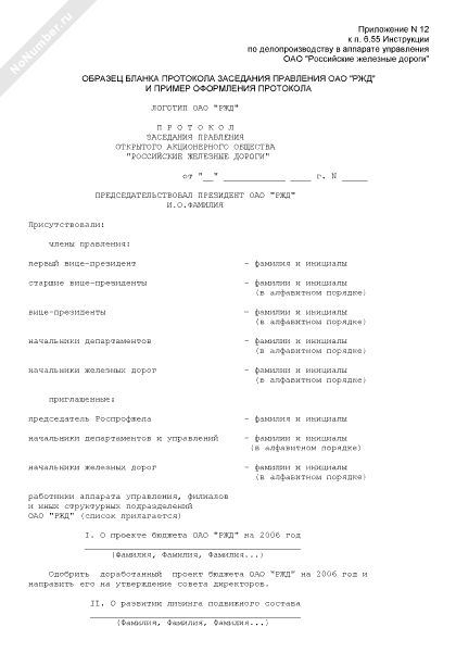 Образец бланка протокола заседания правления ОАО «РЖД» и пример его оформления (рекомендуемый образец заполнения)