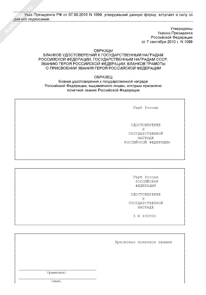 Образец бланка удостоверения Героя Российской Федерации