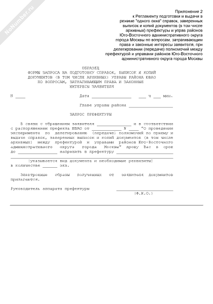 Образец формы запроса префектуры на подготовку справок, выписок и копий документов (в том числе архивных) управы района ЮВАО города Москвы по вопросам, затрагивающим права и законные интересы заявителя