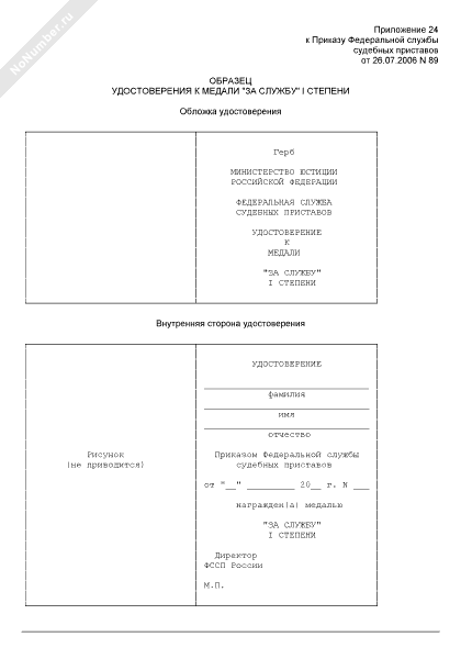 Образец удостоверения к медали Федеральной службы судебных приставов «За службу» I степени (рекомендуемый образец заполнения)