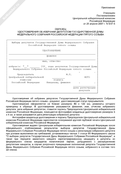 Образец удостоверения об избрании депутатом Государственной Думы Федерального Собрания Российской Федерации пятого созыва (рекомендуемый образец заполнения)