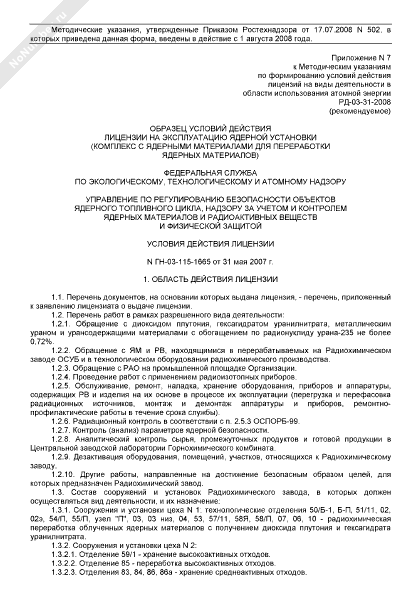 Образец условий действия лицензии на эксплуатацию ядерной установки (комплекс с ядерными материалами для переработки ядерных материалов) (рекомендуемая форма)
