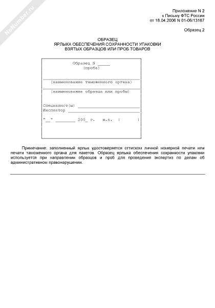 Образец ярлыка обеспечения сохранности упаковки взятых образцов или проб товаров (рекомендуемый образец заполнения)