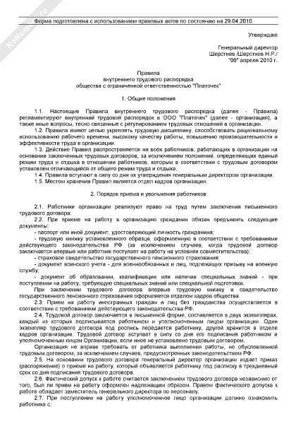 Примерный образец правил внутреннего трудового распорядка общества с ограниченной ответственностью (рекомендуемый образец заполнения)