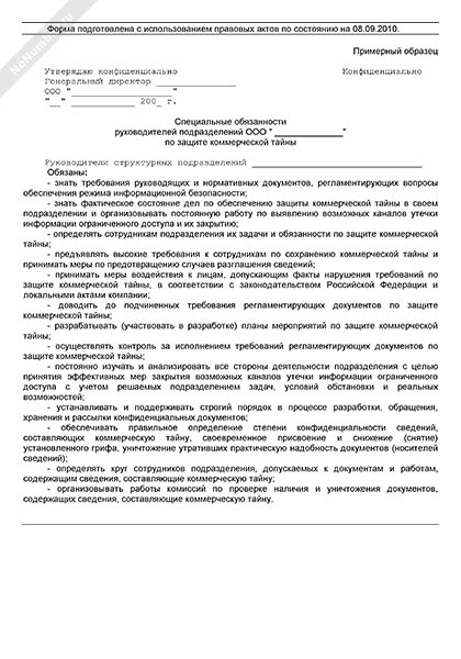 Специальные обязанности руководителей подразделений организации по защите коммерческой тайны (рекомендуемый образец заполнения)