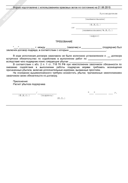 Требование подрядчика о возмещении заказчиком убытков, включая дополнительные издержки, вызванные простоем, в связи с неисполнением заказчиком обязанности оказывать подрядчику содействие в выполнении работы (рекомендуемый образец заполнения)