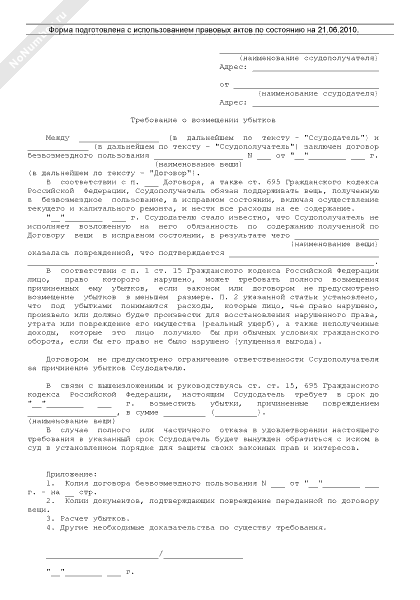 Требование ссудодателя о возмещении ссудополучателем убытков, причиненных повреждением переданной в безвозмездное пользование вещи в связи с неисполнением обязанности по содержанию полученной в безвозмездное пользование вещи в исправном состоянии (рекомендуемый образец заполнения)