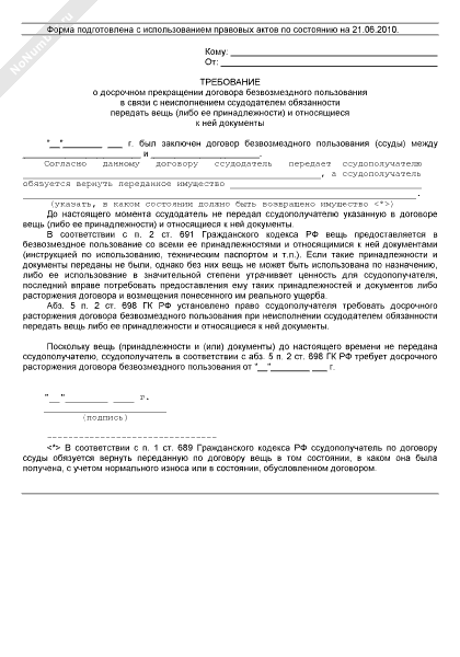 Требование ссудополучателя о досрочном прекращении договора безвозмездного пользования в связи с неисполнением ссудодателем обязанности передать вещь либо ее принадлежности и относящиеся к ней документы (рекомендуемый образец заполнения)