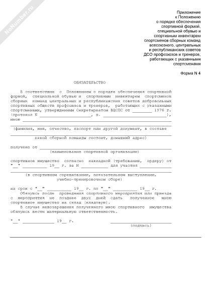 Обязательство о материальной ответственности одиночного спортсмена или тренера (форма № 4)