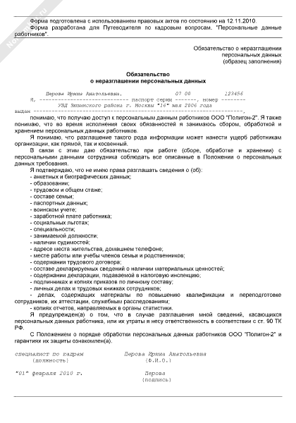 Обязательство о неразглашении персональных данных (рекомендуемый образец заполнения)