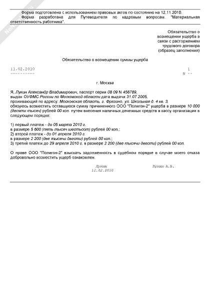 Обязательство о возмещении ущерба в связи с расторжением трудового договора (рекомендуемый образец заполнения)