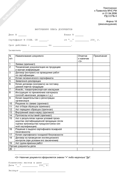 - 2Внутренняя опись документов на проведение работ по сертификации продукции в области пожарной безопасности в Российской Федерации. Форма № 18