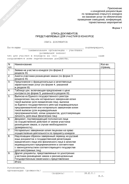 - 131Опись документов, представляемых для участия в конкурсе на оказание услуг по обеспечению проведения совещаний, конференций, торжественных мероприятий на территории Московской области (форма № 1)