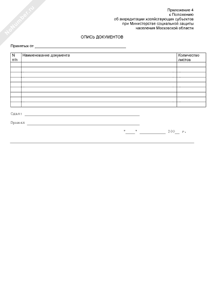 - 134Опись документов, сданных хозяйствующим субъектом в Министерство социальной защиты населения Московской области для получения аттестата аккредитации
