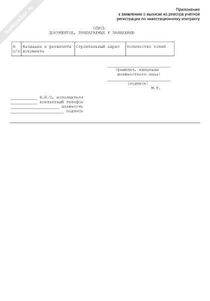 - 136Опись документов, прилагаемых к заявлению о выписке из реестра учетной регистрации по инвестиционному контракту и/или договору о привлечении финансовых средств юридических лиц в строительство жилья города Москвы