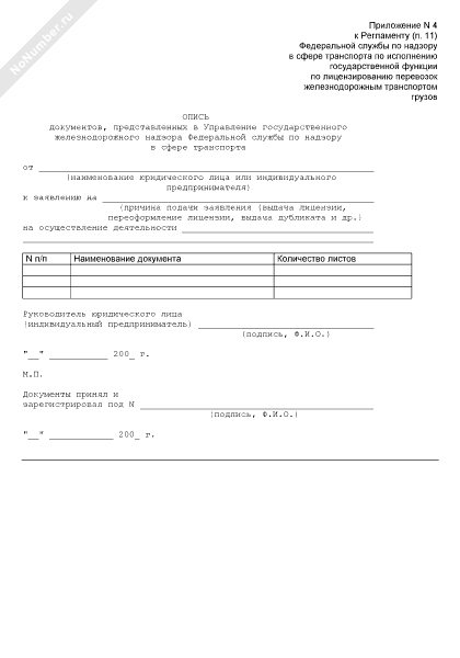- 172Опись документов, представленных в Управление государственного железнодорожного надзора Федеральной службы по надзору в сфере транспорта, соискателем лицензии на осуществление перевозок железнодорожным транспортом грузов