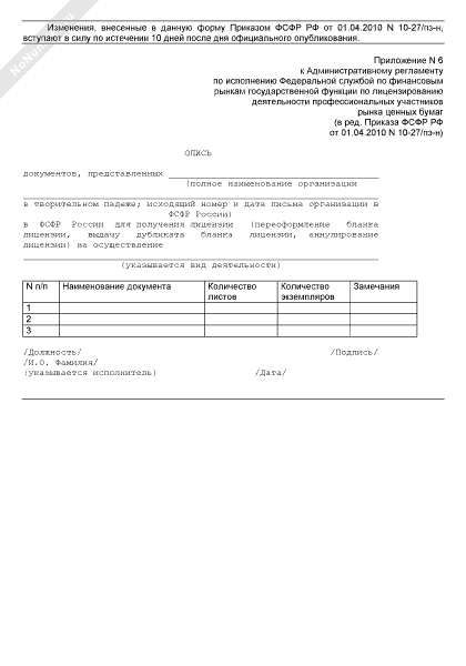 - 174Опись документов, представленных организацией в Федеральную службу по финансовым рынкам для получения лицензии (переоформление бланка лицензии, выдачу дубликата бланка лицензии, аннулирование лицензии) на осуществление деятельности