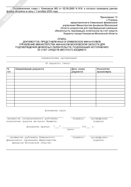- 175Опись документов, представленных в Климовское финансовое управление Министерства финансов Московской области для подтверждения денежных обязательств, подлежащих исполнению за счет средств местного бюджета