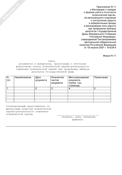 - 167Опись документов и материалов, прилагаемых к итоговому финансовому отчету политической партии/регионального отделения политической партии при проведении выборов депутатов Государственной Думы Российской Федерации (форма № 11)