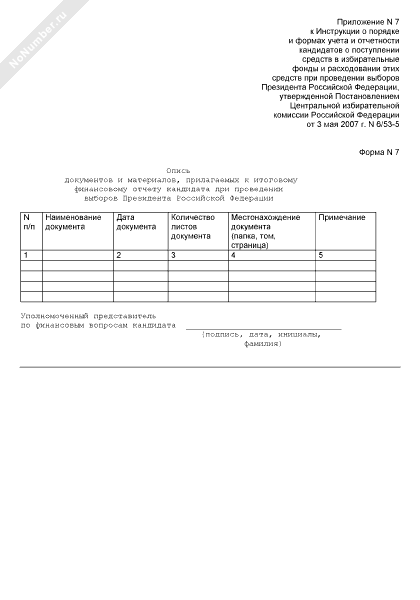 - 166Опись документов и материалов, прилагаемых к итоговому финансовому отчету кандидата при проведении выборов Президента Российской Федерации (форма № 7)