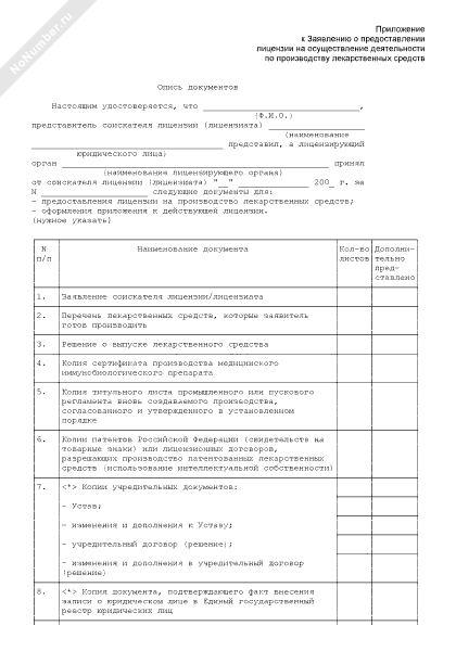 Опись документов (приложение к заявлению о предоставлении лицензии на осуществление деятельности по производству лекарственных средств)