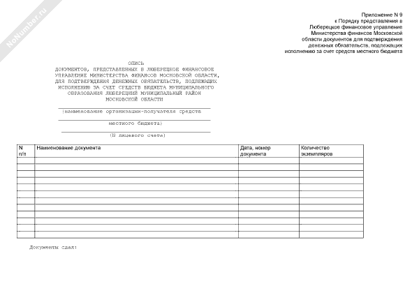 Опись документов, представленных в Люберецкое финансовое управление Министерства финансов Московской области, для подтверждения денежных обязательств, подлежащих исполнению за счет средств бюджета муниципального образования «Люберецкий муниципальный район» Московской области (рекомендуемый образец заполнения)