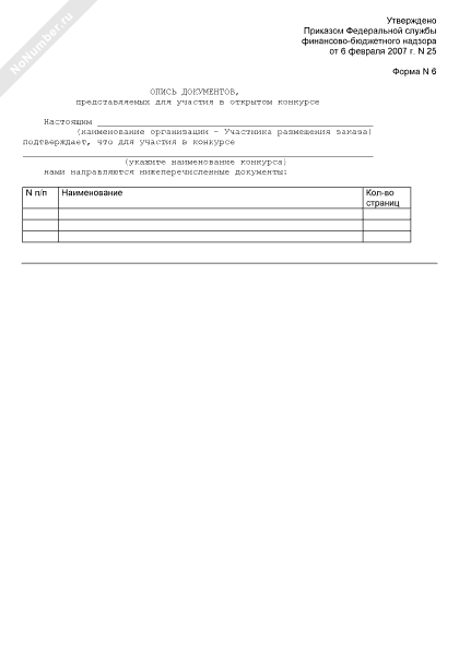 Опись документов, представляемых для участия в открытом конкурсе (форма № 6)