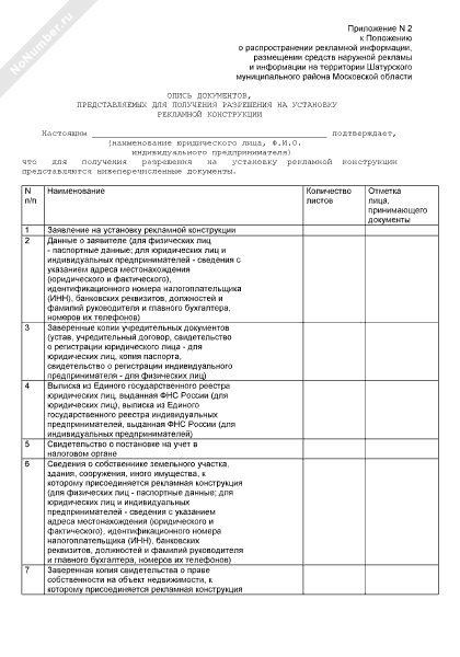 Опись документов, представляемых для получения разрешения на установку рекламной конструкции на территории Шатурского муниципального района Московской области (рекомендуемый образец заполнения)