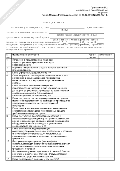 Опись документов (приложение к заявлению в Федеральную службу по надзору в сфере здравоохранения и социального развития о предоставлении лицензии на осуществление деятельности по производству лекарственных средств)