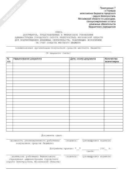 Опись документов, представленных в Финансовое управление администрации городского округа Электросталь Московской области для подтверждения денежных обязательств, подлежащих исполнению за счет средств местного бюджета (рекомендуемый образец заполнения)