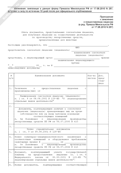 Опись документов, представленных соискателем лицензии, для получения лицензии на осуществление деятельности по производству лекарственных средств, предназначенных для животных (приложение к заявлению о предоставлении лицензии на осуществление деятельности по производству лекарственных средств, предназначенных для животных)