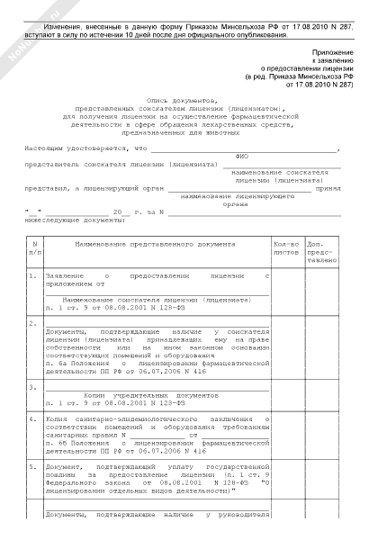Опись документов, представленных соискателем лицензии (лицензиатом), для получения лицензии на осуществление фармацевтической деятельности в сфере обращения лекарственных средств, предназначенных для животных (приложение к заявлению о предоставлении лицензии на осуществление фармацевтической деятельности в сфере обращения лекарственных средств, предназначенных для животных)