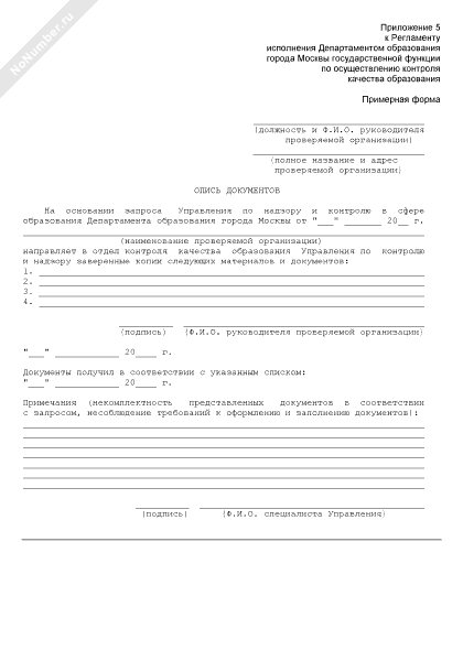 Опись документов, направленных в отдел контроля качества образования Управления по контролю и надзору для проведения проверки качества образования в г. Москве (рекомендуемый образец заполнения)