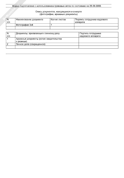 Опись документов, находящихся в конверте, прилагаемом к личному делу работника (рекомендуемый образец заполнения)
