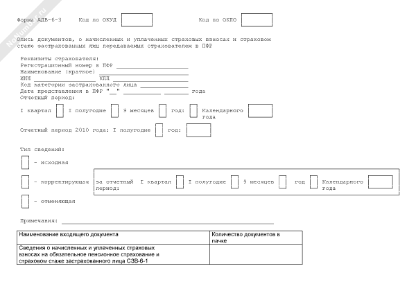 Опись документов, о начисленных и уплаченных страховых взносах и страховом стаже застрахованных лиц передаваемых страхователем в ПФР. Форма № АДВ-6-3 (рекомендуемый образец заполнения)