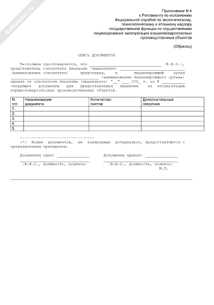 Опись документов для предоставления лицензии на эксплуатацию взрывопожароопасных производственных объектов (рекомендуемый образец заполнения)