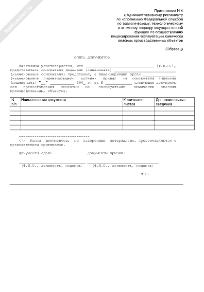 Опись документов для предоставления лицензии на эксплуатацию химически опасных производственных объектов (рекомендуемый образец заполнения)