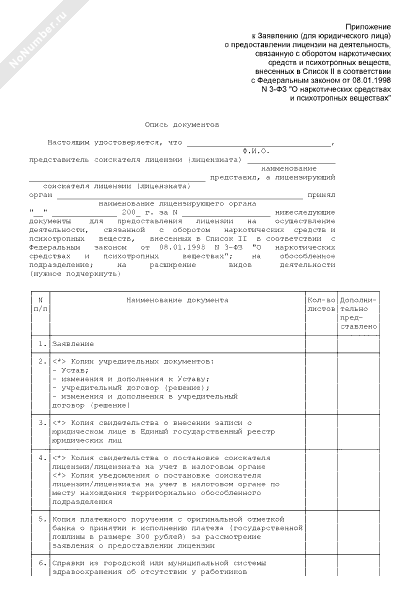 Опись документов (приложение к заявлению (для юридического лица) о предоставлении лицензии на деятельность, связанную с оборотом наркотических средств и психотропных веществ, внесенных в список II в соответствии с Федеральным законом от 08.01.1998 № 3-ФЗ «О наркотических средствах и психотропных веществах»)