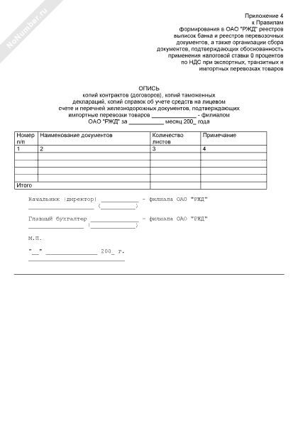 Опись копий контрактов (договоров), копий таможенных деклараций, копий справок об учете средств на лицевом счете и перечней железнодорожных документов, подтверждающих импортные перевозки товаров