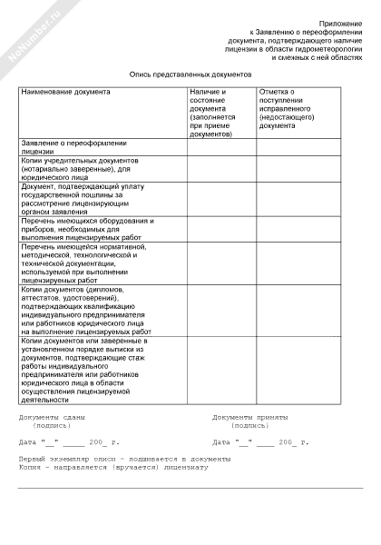Опись представленных документов (приложение к заявлению о переоформлении документа, подтверждающего наличие лицензии на осуществление вида деятельности в области гидрометеорологии и смежных с ней областях)