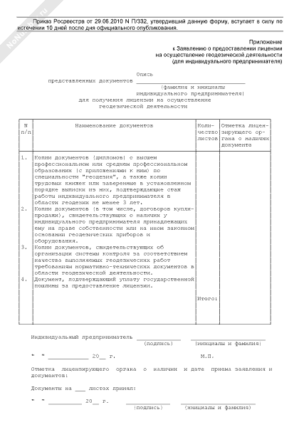 Опись представленных документов для получения лицензии на осуществление геодезической деятельности (приложение к заявлению о предоставлении лицензии на осуществление геодезической деятельности (для индивидуального предпринимателя))