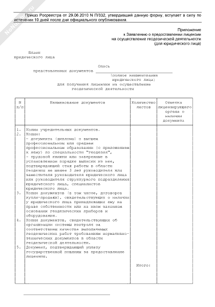 Опись представленных документов для получения лицензии на осуществление геодезической деятельности (приложение к заявлению о предоставлении лицензии на осуществление геодезической деятельности (для юридического лица))