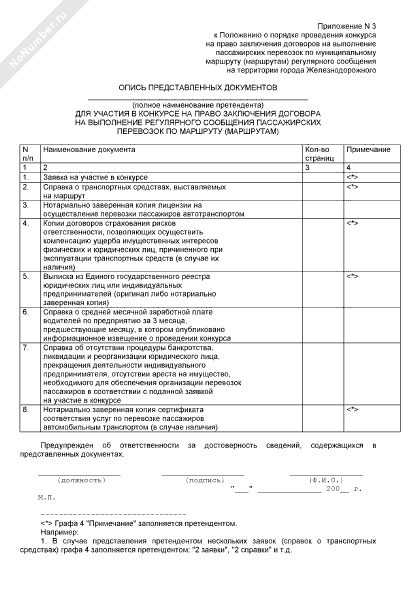 Опись представленных документов для участия в конкурсе на право заключения договора на выполнение регулярного сообщения пассажирских перевозок по маршруту (маршрутам) регулярного сообщения на территории города Железнодорожного Московской области